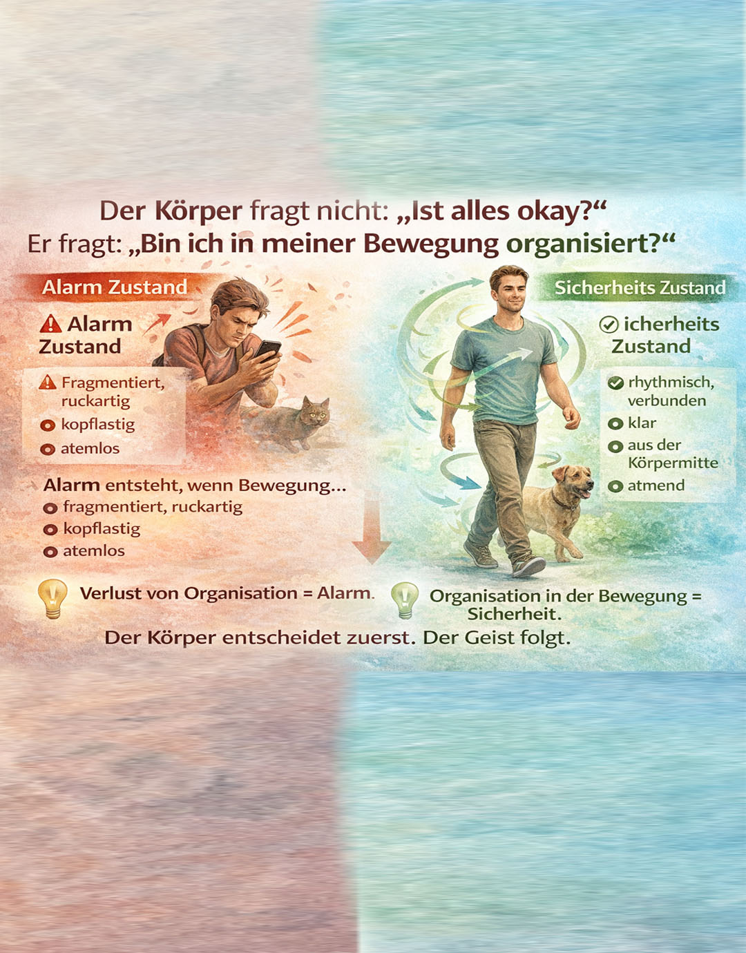 Jan 30 20260Panik – Alarm – Sicherheit und deine Bewegung!Sie hängen direkt zusammen!Mensch – Pferd Ein zentraler Zusammenhang zwischen Bewegung, Angst oder Sicherheit Viele Bewegungsmuster entstehen nicht durch Angst, sondern erzeugen sie. Alarm entsteht nicht nur durch äußere Gefahr, sondern durch körperliche Muster, die das Nervensystem als „Bedrohung“ interpretiert. Angst,